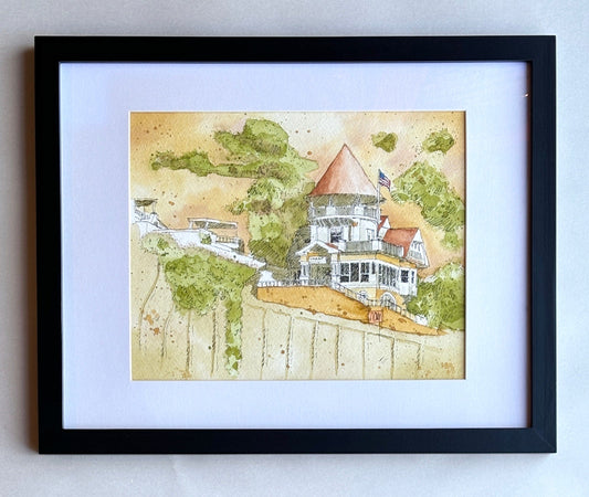 "Wrigley Mansion Avalon" Original Watercolor and Ink Painting - Framed